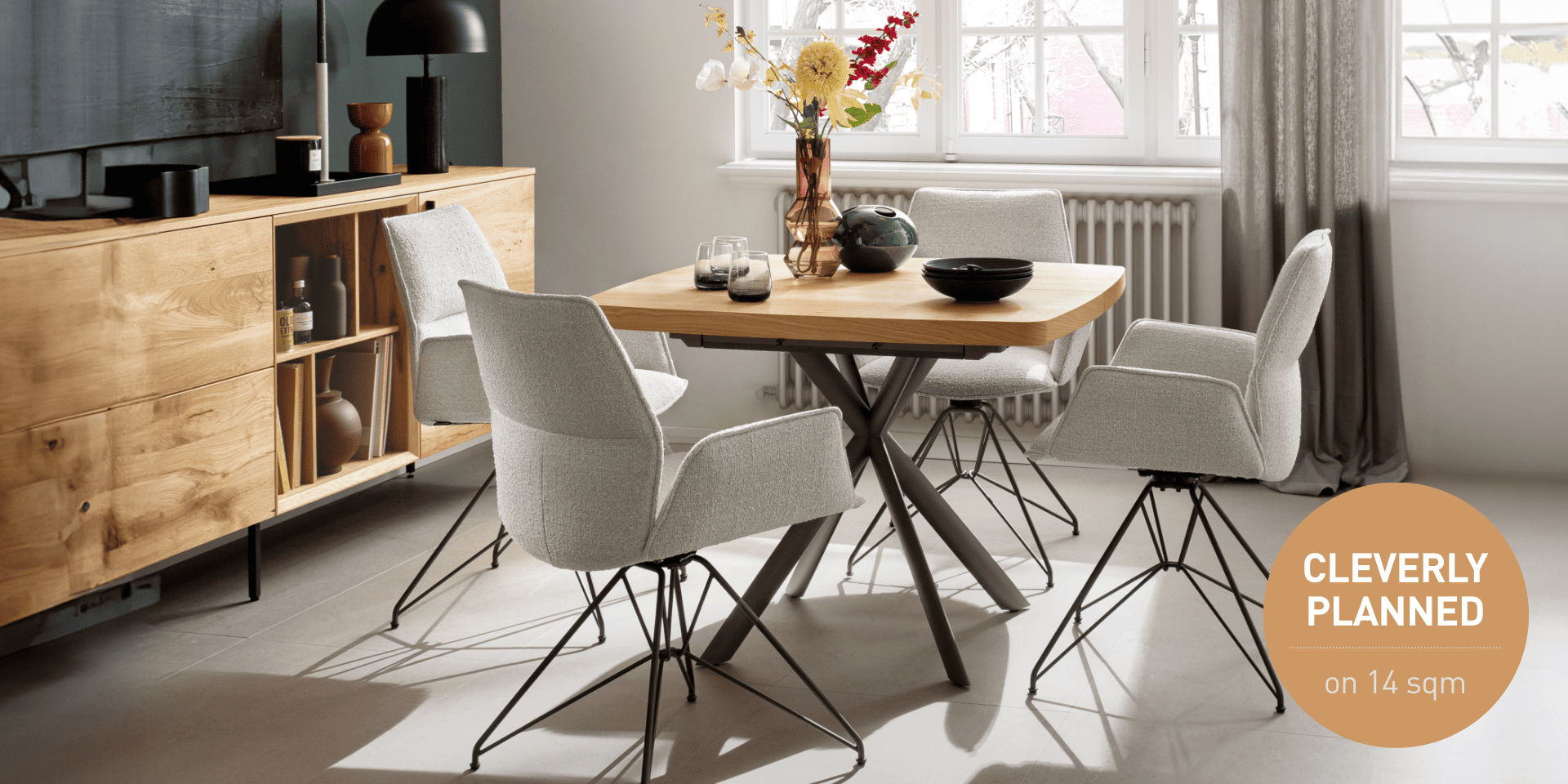 Square shapes have great potential. A touch of Scandinavian charm: A dining area with ample versatility, where natural elements set the tone. The extendable table and chairs with a swivel function make optimal use of corner areas