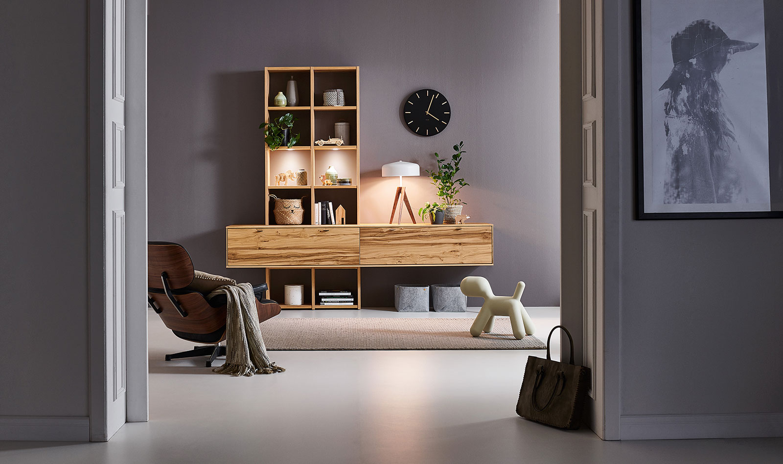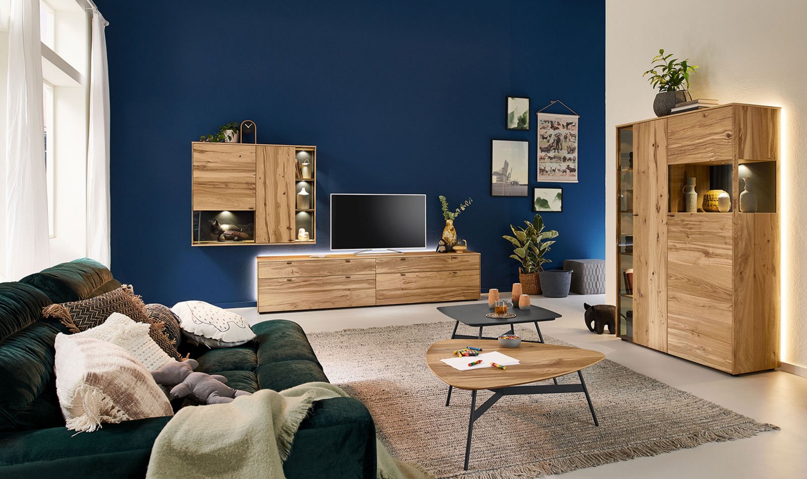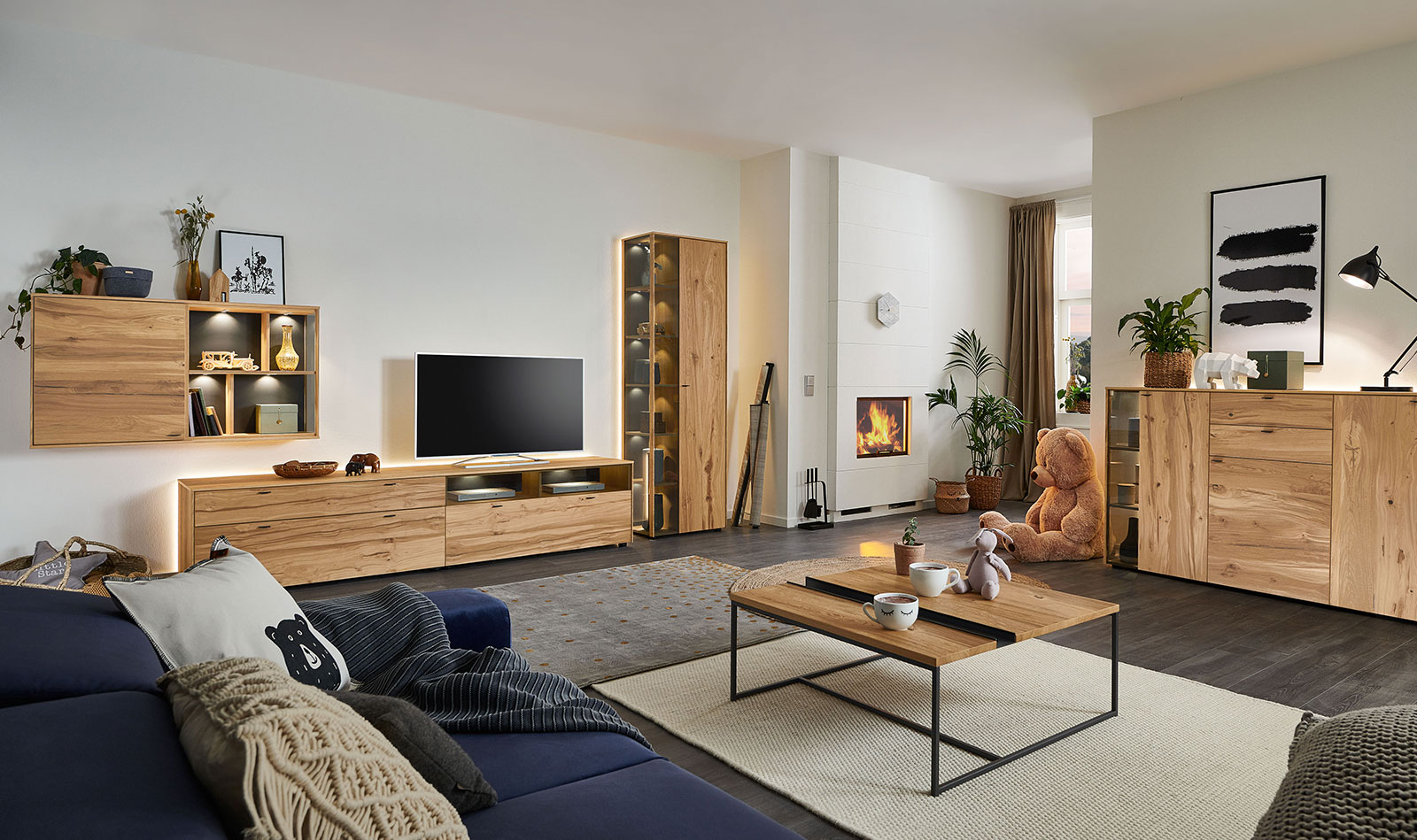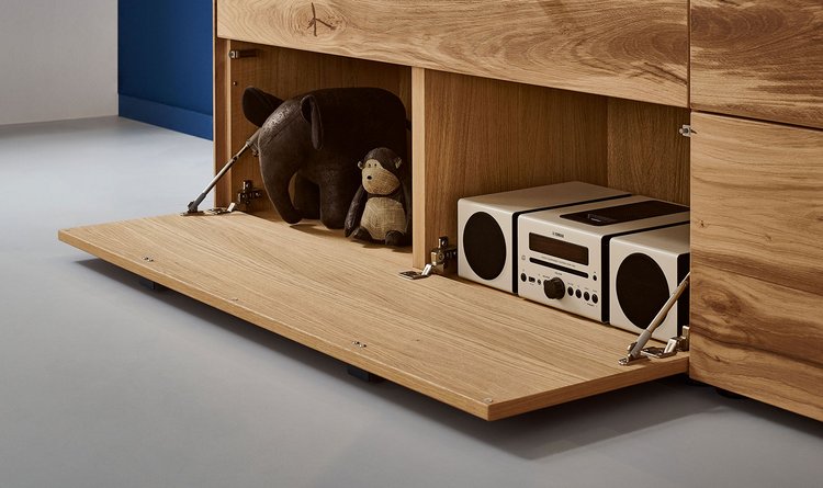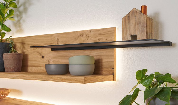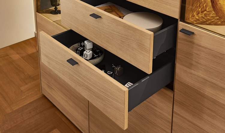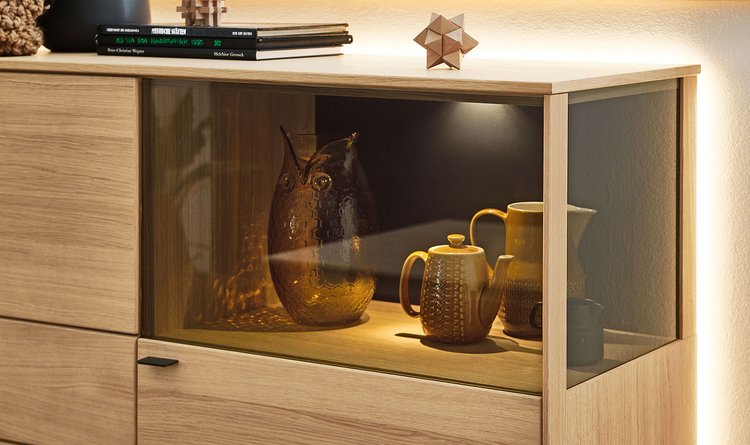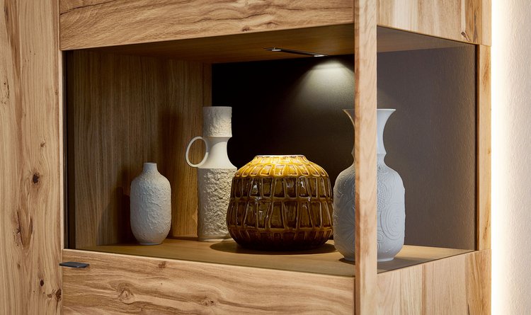 In the PLAN X range of designs, X3 is the "natural" one. The real oak wood veneer is fine grained and soft structured – pure wood for a harmonious design that matches your natural interior furnishing style. Moreover, there are lovingly detailed highlights in the rear panel: matt lacquered finishes or wood elements create gently contrasts and are perfectly staged by dimmable LED lights. Choose a furniture design in oak rustico light or oak light oiled from the X3 range, and look forward to attractive LED compartment lighting and ambient lighting, as well as drawers with self-closing mechanism.