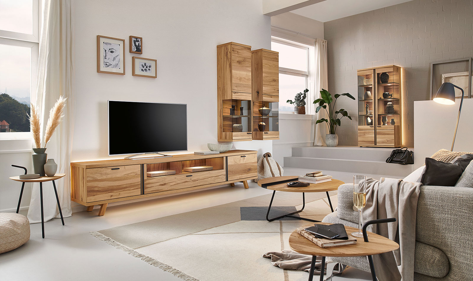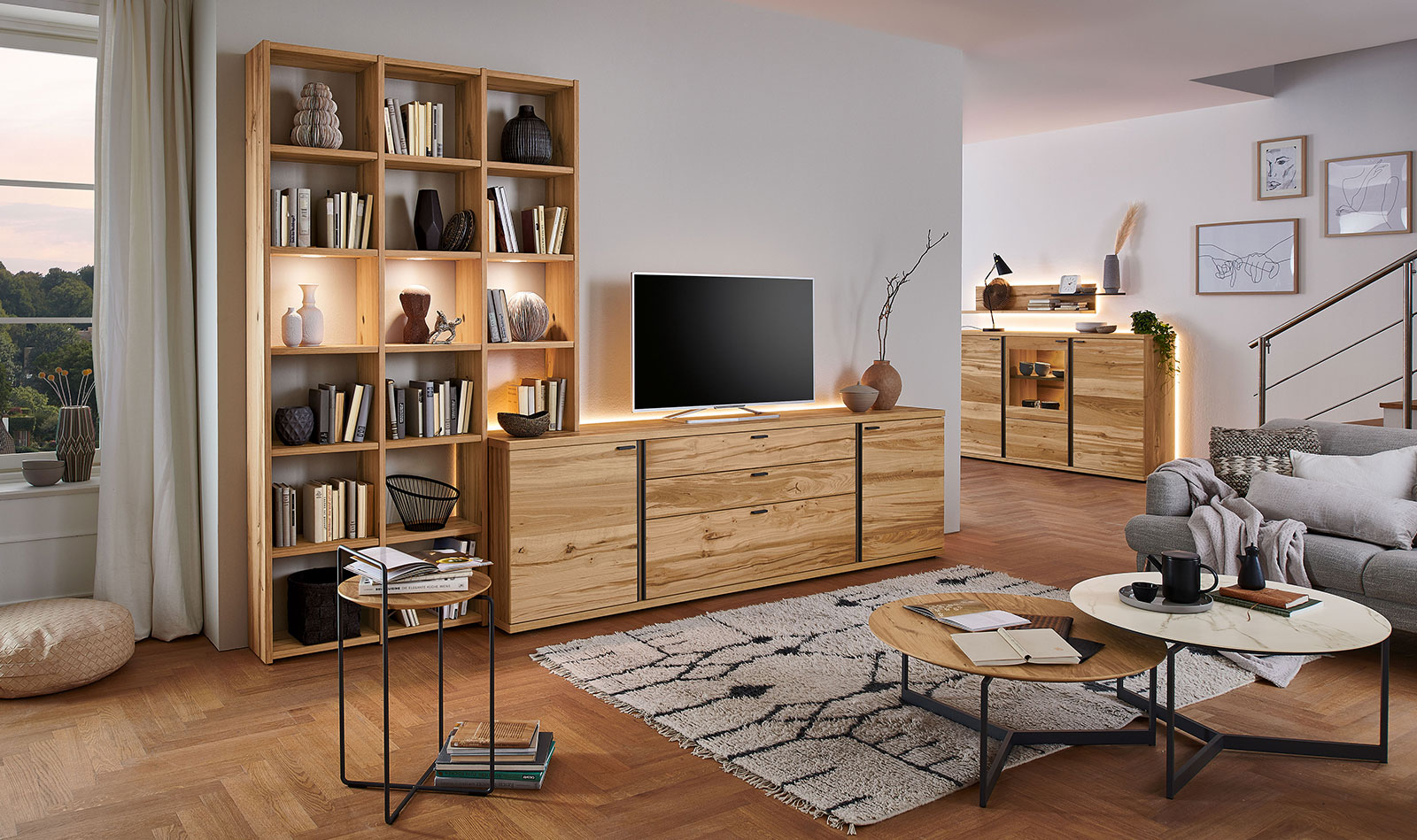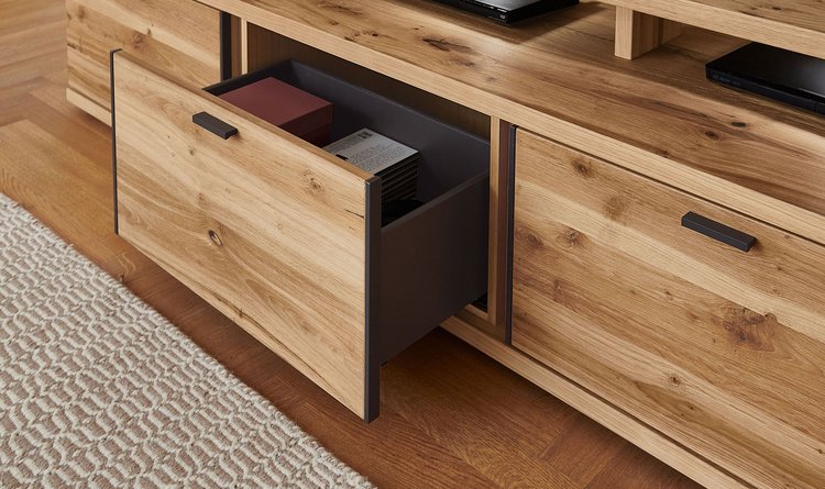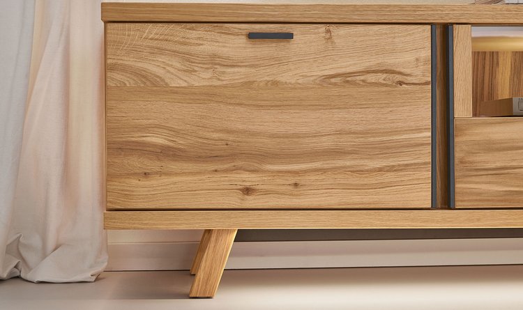 In the PLAN X range of designs, X4 is the "timeless" one. Expressively grained wood and metal handles as sophisticated design elements define the character of the furniture. The graining appears to dance in the light, and the metal handles running vertically to this add a modern highlight that makes the X4 look timelessly beautiful in living rooms. Plus there is plenty of storage space – for perfection in design and function. Look forward to a design in oak rustico light with an oiled finish, metal handles in anthracite, LED lighting and gently closing drawers with self-closing mechanism.