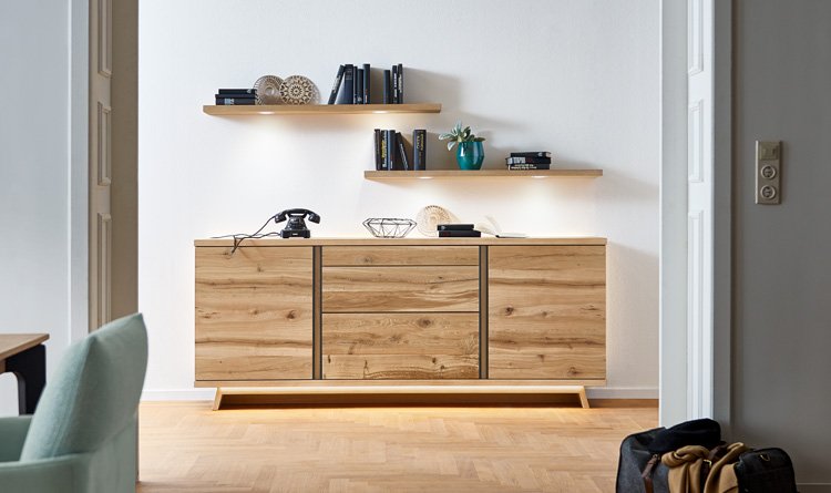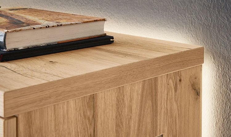Designkompetenz und meisterhaftes Möbelhandwerk verbinden sich in BAROLA zu einer ganz besonderen Melange. Allein das elegant geformte Holzuntergestell: An den Seiten fein geschrägt, unter dem Möbel leicht zurückversetzt und im Zusammenspiel mit einem versteckten LED-Lichtband die Basis großer Leichtigkeit. Und immer dabei: Griffleisten in Metall anthrazit.