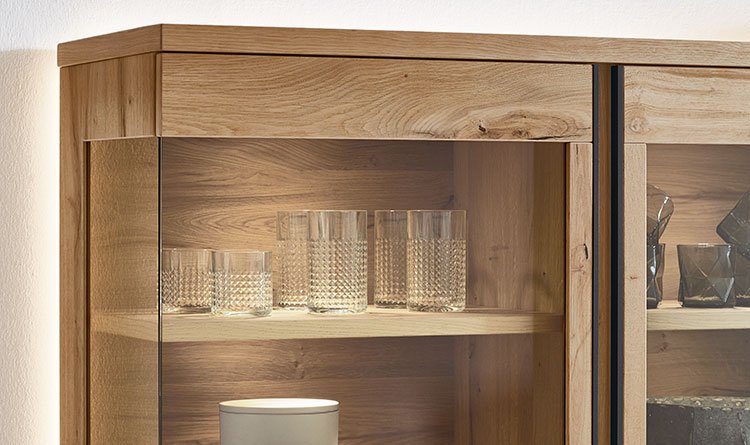 Die Maserung: so ursprünglich und zeitlos schön. Das Handwerk: so authentisch und detailverliebt. Die Gestaltungsmöglichkeiten: so vielfältig und individuell. Helles Eiche-Echtholzfurnier kombiniert mit Türen aus leicht grau getöntem Parsolglas: für feinste optische Nuancen, Ausführung auch über Eck. Dazu feine Lichtakzente!
