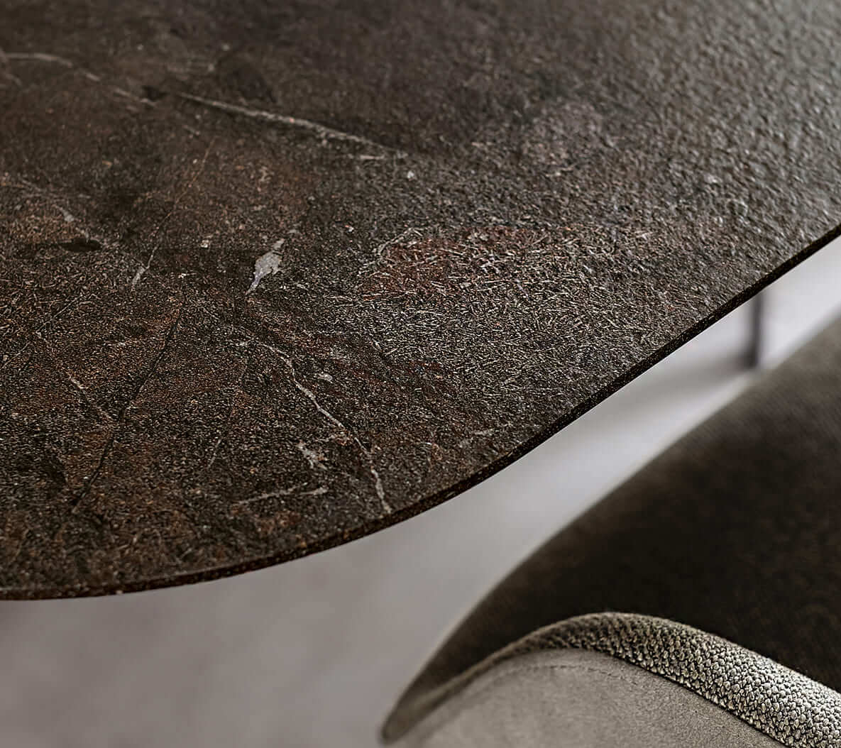 Die abgerundete Tischecke der Keramik-Tischplatte.