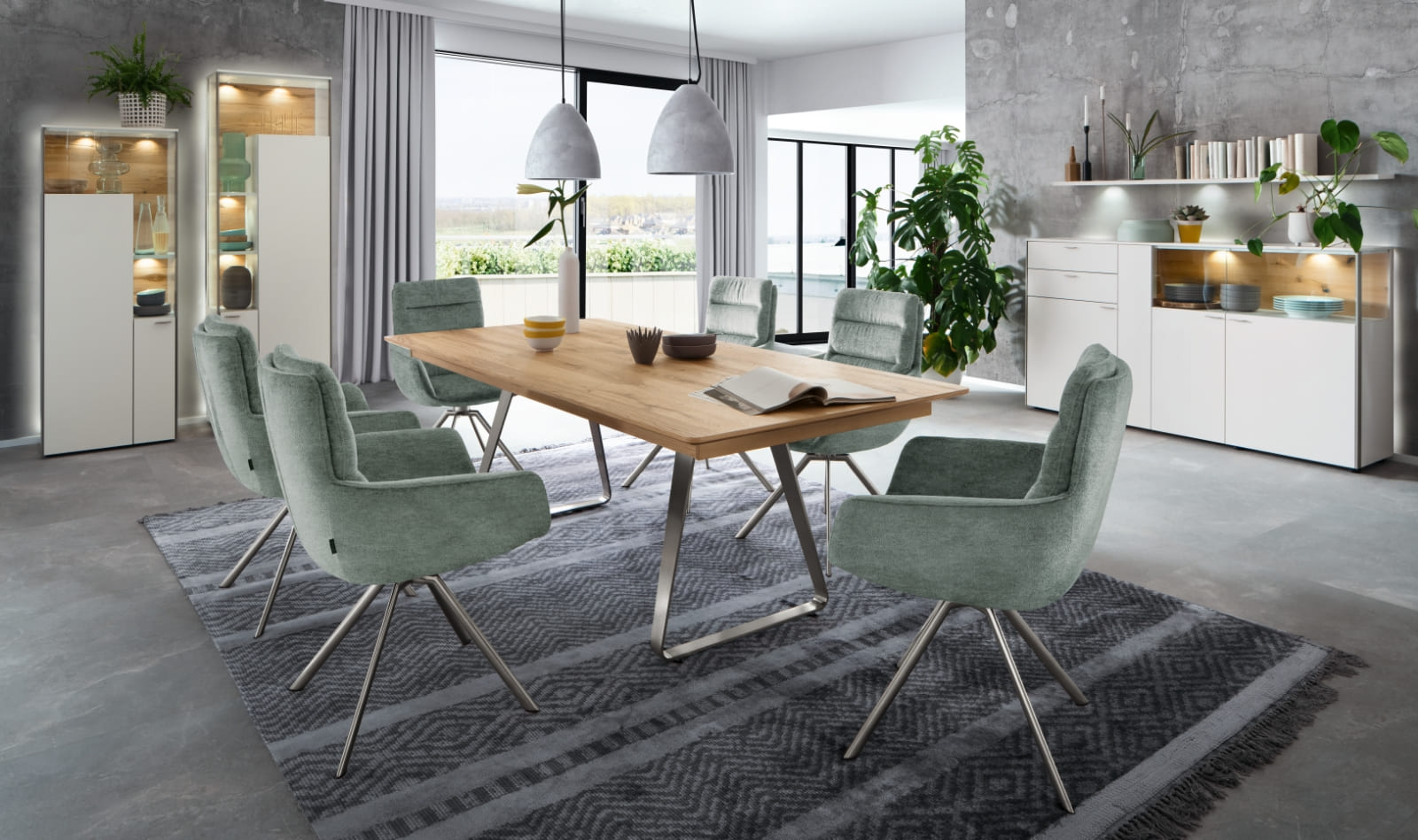 Traumauswahl fürs Esszimmer: mit Lack schiefergrau matt und Lack kristallweiß matt. Erleben Sie einen echten Venjakob-Klassiker, der mit spektakulären Ansichten und transparenten Einsichten brilliert. Faszinierend: die integrierten Glastüren über Eck. Aufregend: die stilsicheren Materialkombinationen. Bestes Beispiel: die eleganten Aluleisten in metallfarbig matt, kristallweiß matt und schiefergrau matt. SENTINO 3000 ist ein Genuss fürs Auge – und das isst ja bekanntlich mit.