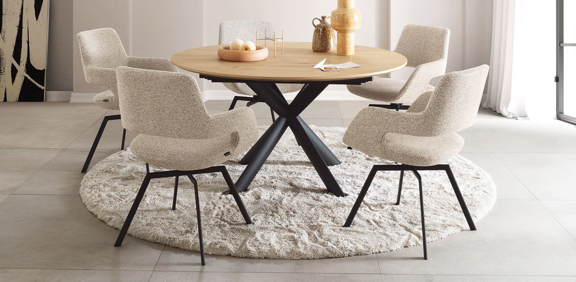Auf Harmonie setzen. Ein runder Tisch nimmt weniger Platz ein und lässt Luft zum Atmen. Und sorgt ganz nebenbei für ein ausgeglichenes Raumgefühl.