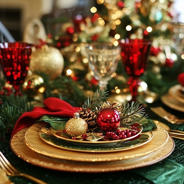 oder farbige Tischdecke wird zur Bühne für klassischen Tischschmuck wie Tannenzweige, Zapfen, goldene Kerzenständer und Weihnachtskugeln. Farbige Kristallgläser, Geschirr und Besteck mit goldenen Akzenten interpretieren den Stil modern, für einen Hauch von Eleganz sorgt klassisches weißes Porzellan.