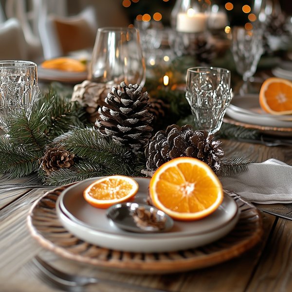 Direkt auf der Tischplatte aus Holz werden natürliche Materialien in Szene gesetzt. Mit Geschirr aus rustikalem Steingut oder Keramik und Dekoelementen wie getrocknete Orangenscheiben, Zimtstangen sowie Zapfen und Zweigen vom letzten Waldspaziergang.