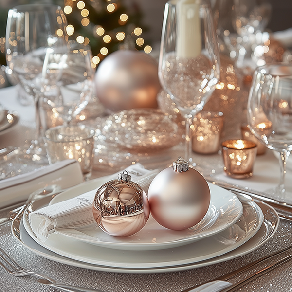Auf einer weißen Tischdecke mit dezentem Glitzer-Effekt kommen Elemente im Farbschema Silber, Weiß, Rosé und Metallic perfekt zur Geltung – vom Festtags-Geschirr über die Stoffservietten in Weiß über glänzende Weihnachtskugel bis hin zu den Kerzenhaltern aus farbigem Glas. Ein dekoratives Extra für die Gäste sind spiegelnde Untersetzer.