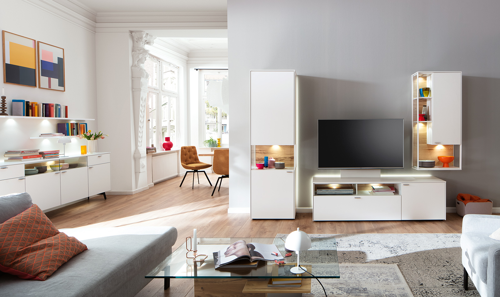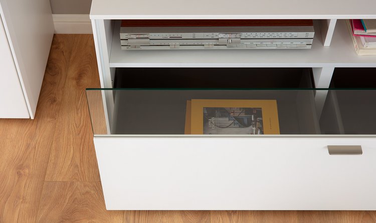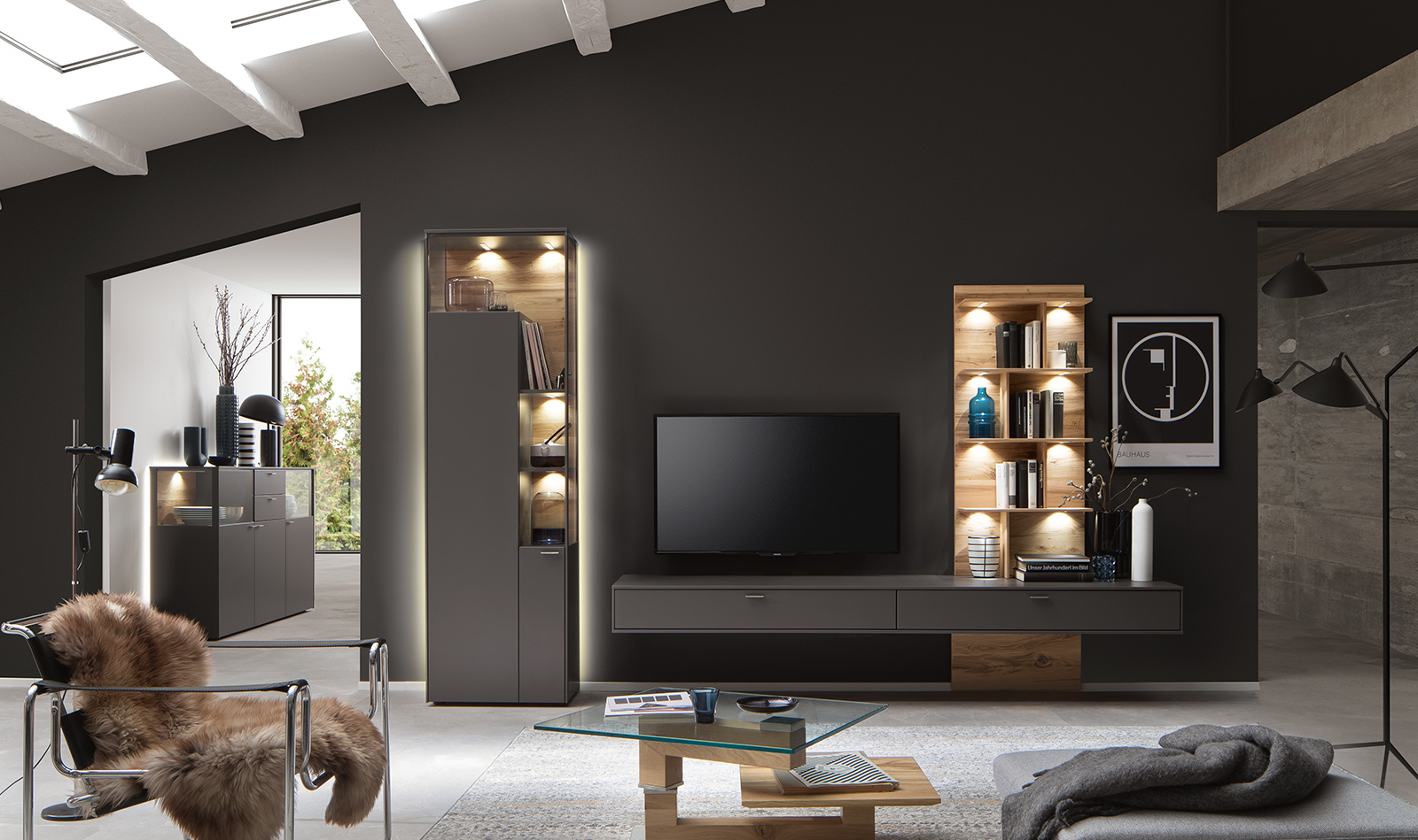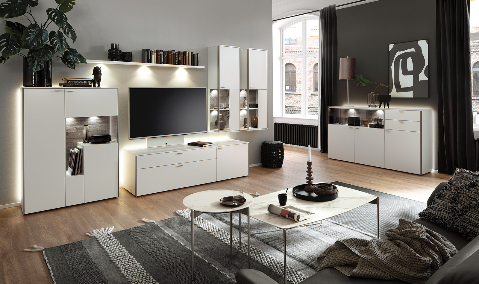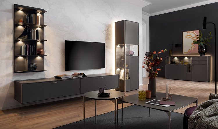 Beginnen wir oberflächlich: mit Lack schiefergrau matt und Lack kristallweiß matt. Erleben Sie einen echten Venjakob-Klassiker, der mit spektakulären Ansichten und transparenten Einsichten brilliert. Faszinierend: die integrierten Glastüren über Eck. Aufregend: die stilsicheren Materialkombinationen. Bestes Beispiel: die eleganten Aluleisten in metallfarbig matt, kristallweiß matt und schiefergrau matt. SENTINO 3000 ist ein Genuss fürs Auge. Und für Ihr Wohnzimmer eine stilsichere Entscheidung.