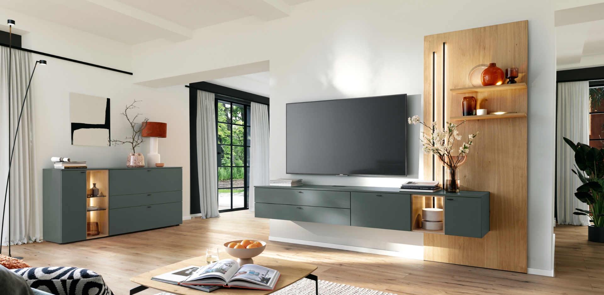 VANYA – das neue Möbelprogramm: Korpus und Front in den 3 neuen Lackfarben angoraweiß matt, steingrau matt und smaragdgrün matt lieferbar. Akzentfächer, Paneele und Hängetypen in der Dekorfarbe Halifax Eiche natur sowie im Echtholzfurnier Wildeiche hell soft gebürstet geölt möglich.